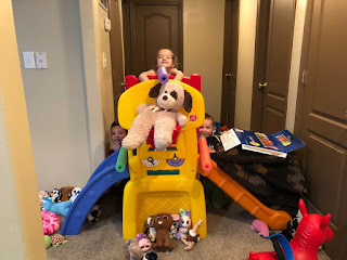 The kids built a castle downstairs, complete with places for them all to sleep, guards (their stuffed animals), and horses and swords to defend against bad guys. They each have a telescope to look through to keep a watch out for the bad guys. I love when they all find something to play together!